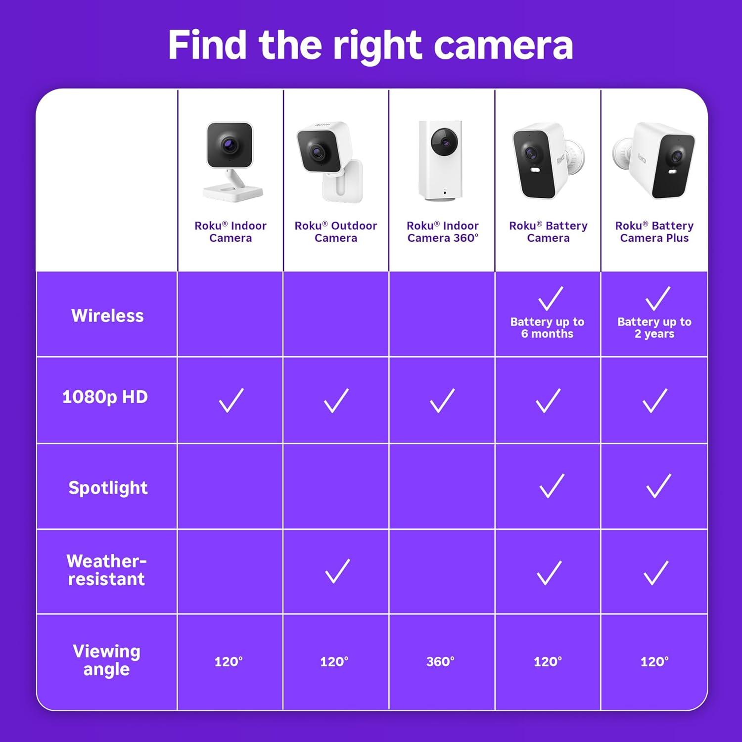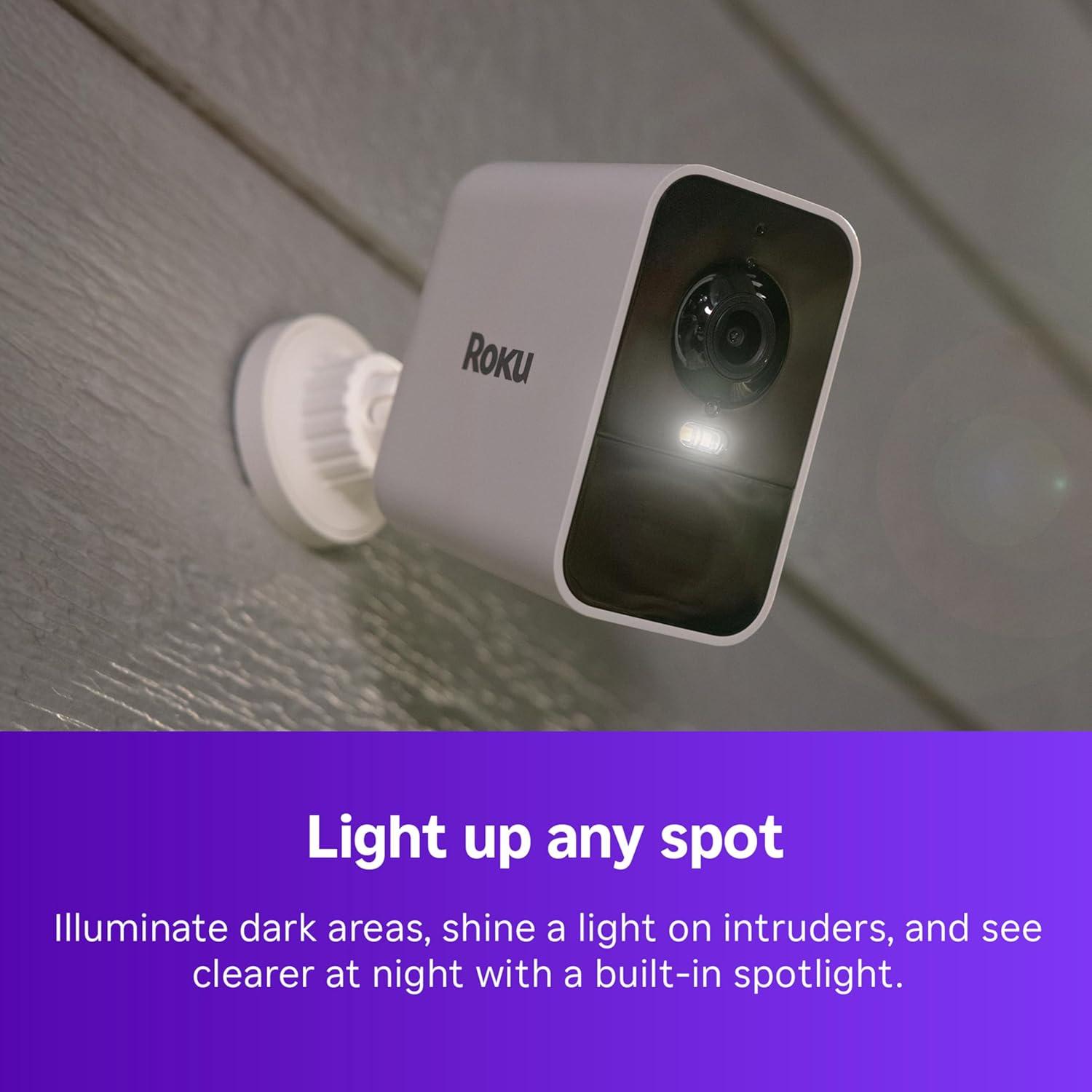 Put eyes and ears anywhere with this wireless Roku Battery Camera Plus. This outdoor-indoor camera for home security gets up to two years* of use on one single charge. Our surveillance and security camera has instant motion detection and IP65-rated weather-resistant design, so you won't miss a thing—even in rain or snow. App-guided setup makes installation of our smart home surveillance camera a snap. Place this battery operated security camera at the front door and monitor who’s coming and going in full-color HD video, or on the fence to catch trespassers after dark with a built-in spotlight. Unlock the full potential of your battery powered camera system with a Roku Smart Home Subscription —it allows you to view recorded events with 14-day cloud storage and enjoy smart detection that can identify people, packages, pets, and cars. Our Wi-Fi camera product is perfect for pet monitoring and baby monitoring. Check the cam feed from your Roku TV or player and use two-way audio on your computer and mobile app to talk to visitors like you’re right there. *Battery life will vary based on device settings, use, and environmental factors.