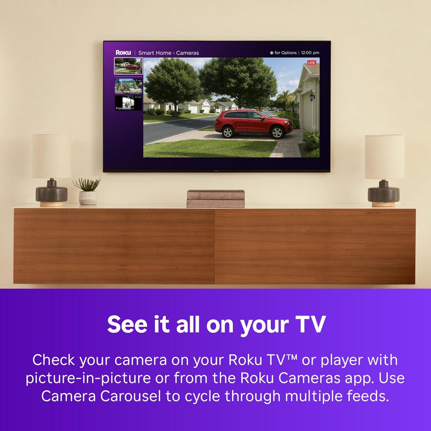 See it all on your TV: Check your camera on your Roku TV or player with picture-in-picture or from the Roku Cameras app. Have multiple cameras? Use Camera Carousel to cycle through each feed and pull up a specific camera when motion is detected.