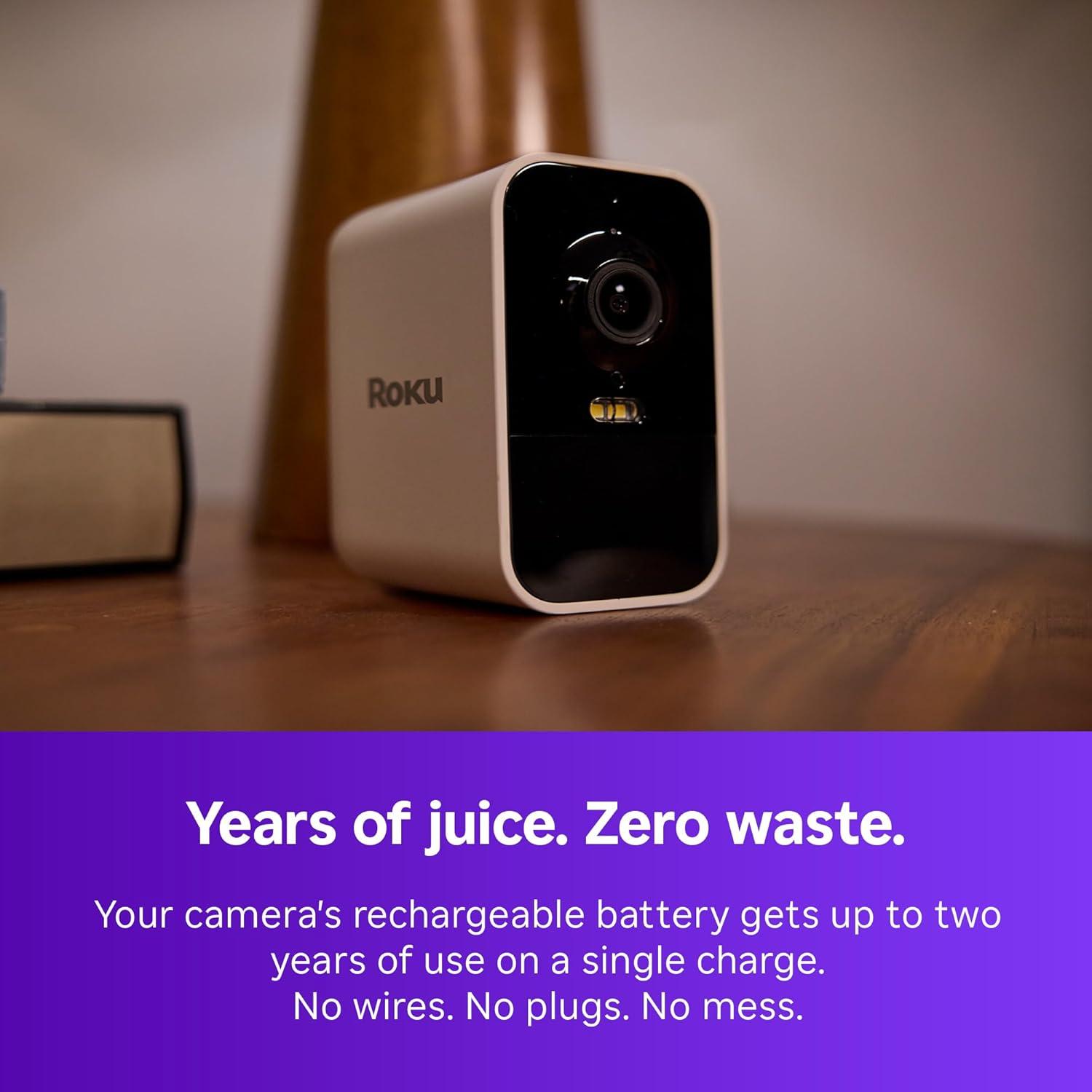 One battery. Years of juice. Zero waste: No need to get back up there. Roku Battery Camera Plus has an eco-friendly rechargeable battery that lasts up to two years* on a single charge.