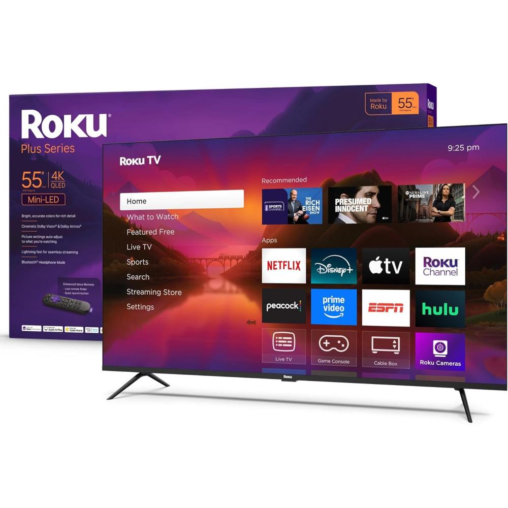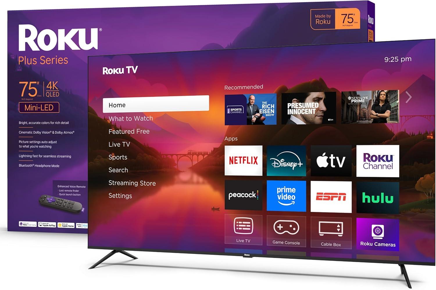 Roku Smart TV 2025 – 75-Inch Plus Series, Mini-LED TV – RokuTV with Enhanced Voice Remote – Flat Screen 4K QLED Television with Dolby Vision & Wi-Fi for Streaming Live Local News, Sports(TV only)