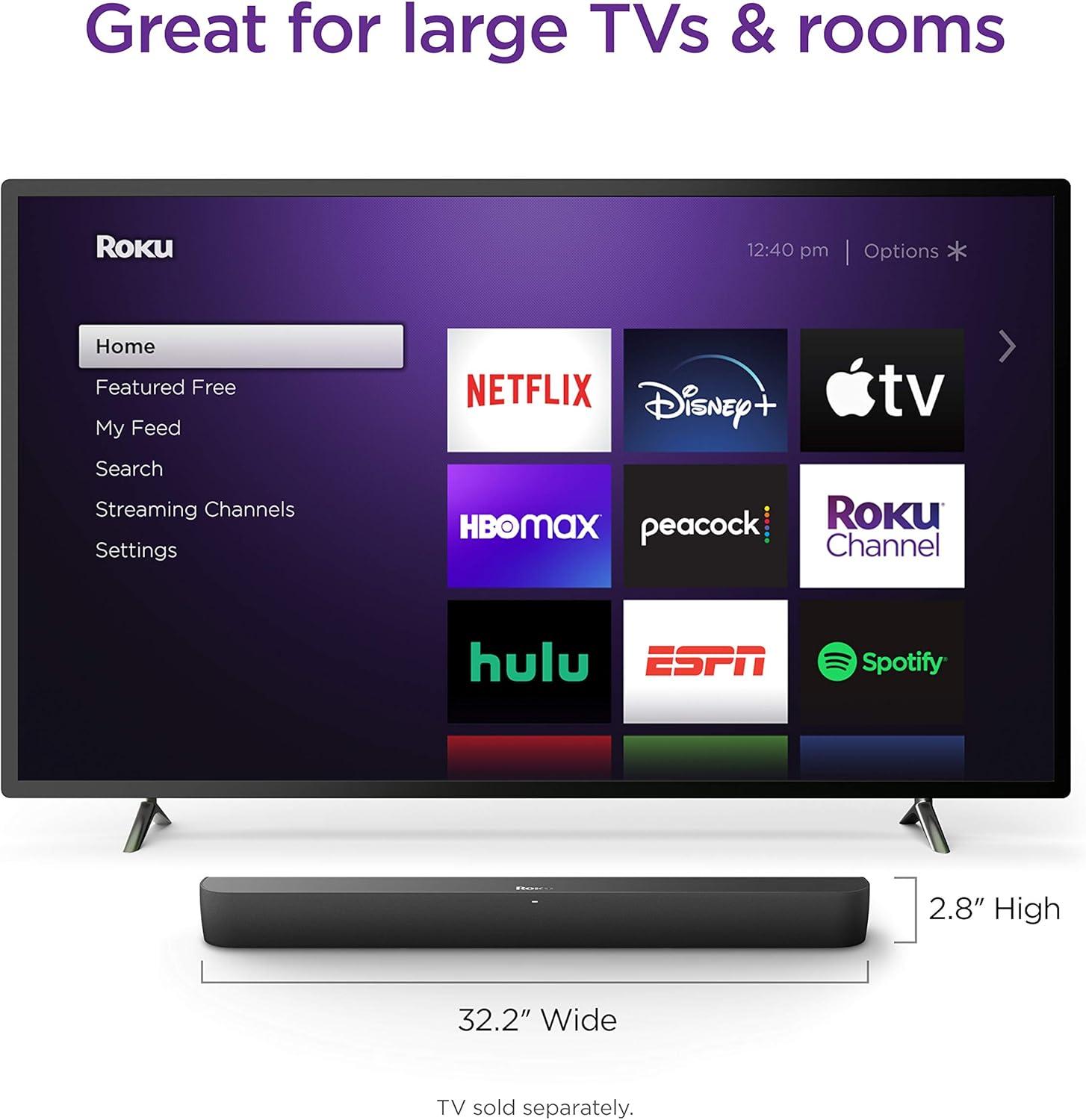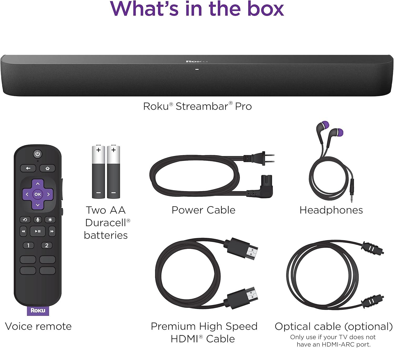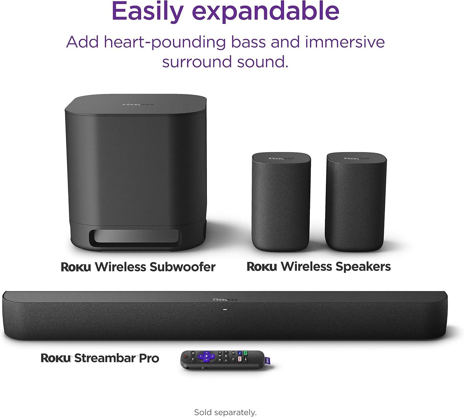 Roku Streambar Pro is the ultimate 2-in-1 entertainment upgrade with Roku streaming and cinematic sound for any TV. Upgrade to America’s #1 TV streaming platform* and enjoy a massive selection of free and live TV in vibrant 4K HDR picture quality. The customizable home screen puts your favorite channels like Netflix, Prime Video, Amazon Freevee, Disney+, HBO Max, Apple TV+, and Hulu front and center. Enjoy an immersive audio experience with virtual surround. Crisp, clean audio makes dialogue easier to hear. You can even quiet loud commercials automatically plus stream music with Bluetooth®. Setup is simple with everything in the box, including the Roku voice remote with that controls your TV, sound, and streaming and has personal shortcuts and a lost remote finder. For even bigger sound, add deep, rich bass with Roku Wireless Bass Pro and immersive surround sound with Roku Wireless Speakers (sold separately). Just plug in and wirelessly pair. Roku is America’s #1 TV streaming platform based on hours streamed – Hypothesis Group, December 2022.