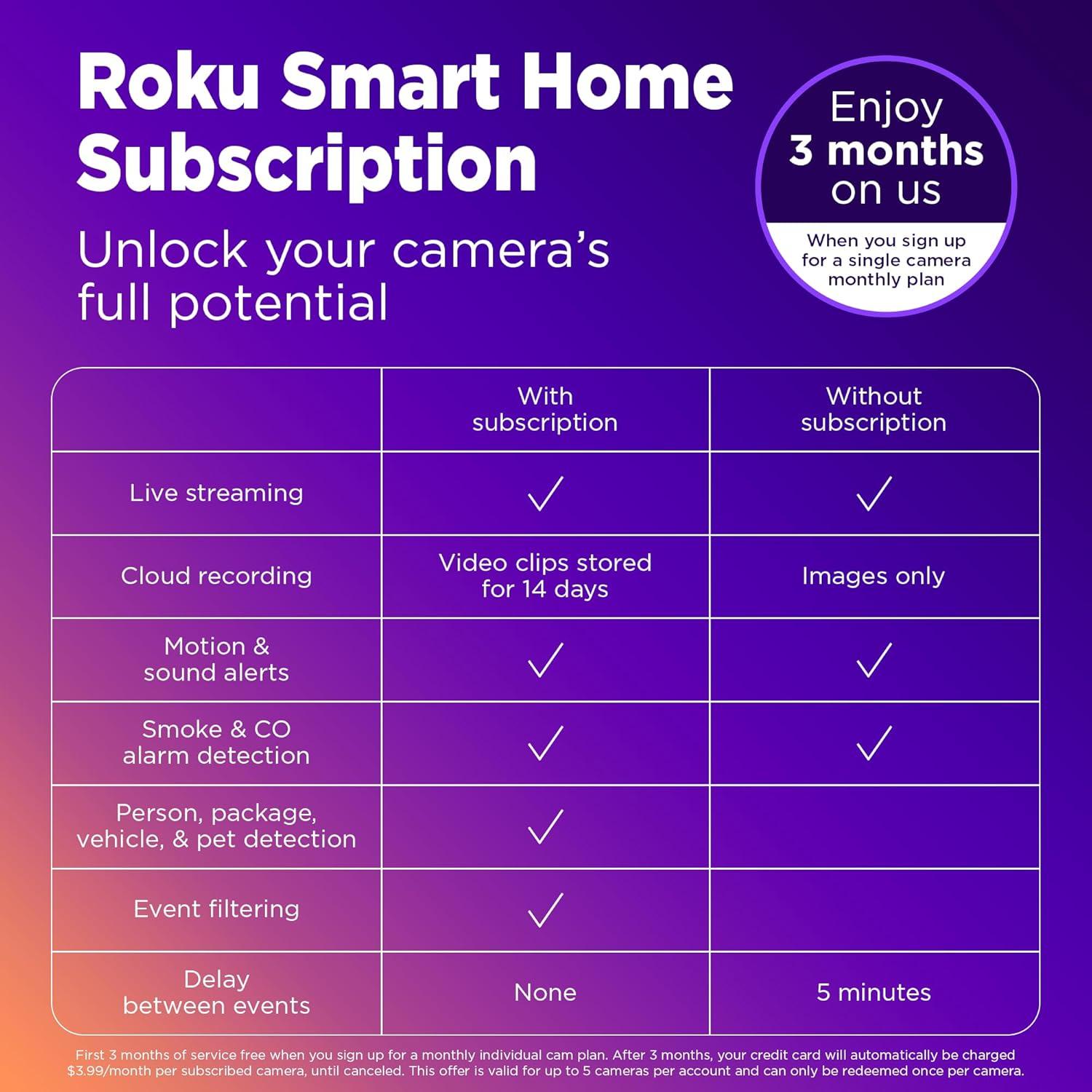 Our treat: Get 3 months of a Roku Smart Home subscription on us when you sign up for the single camera monthly plan. It includes 14-day cloud storage for video, plus smart detection that discerns whether that motion alert was a person, pet, or package