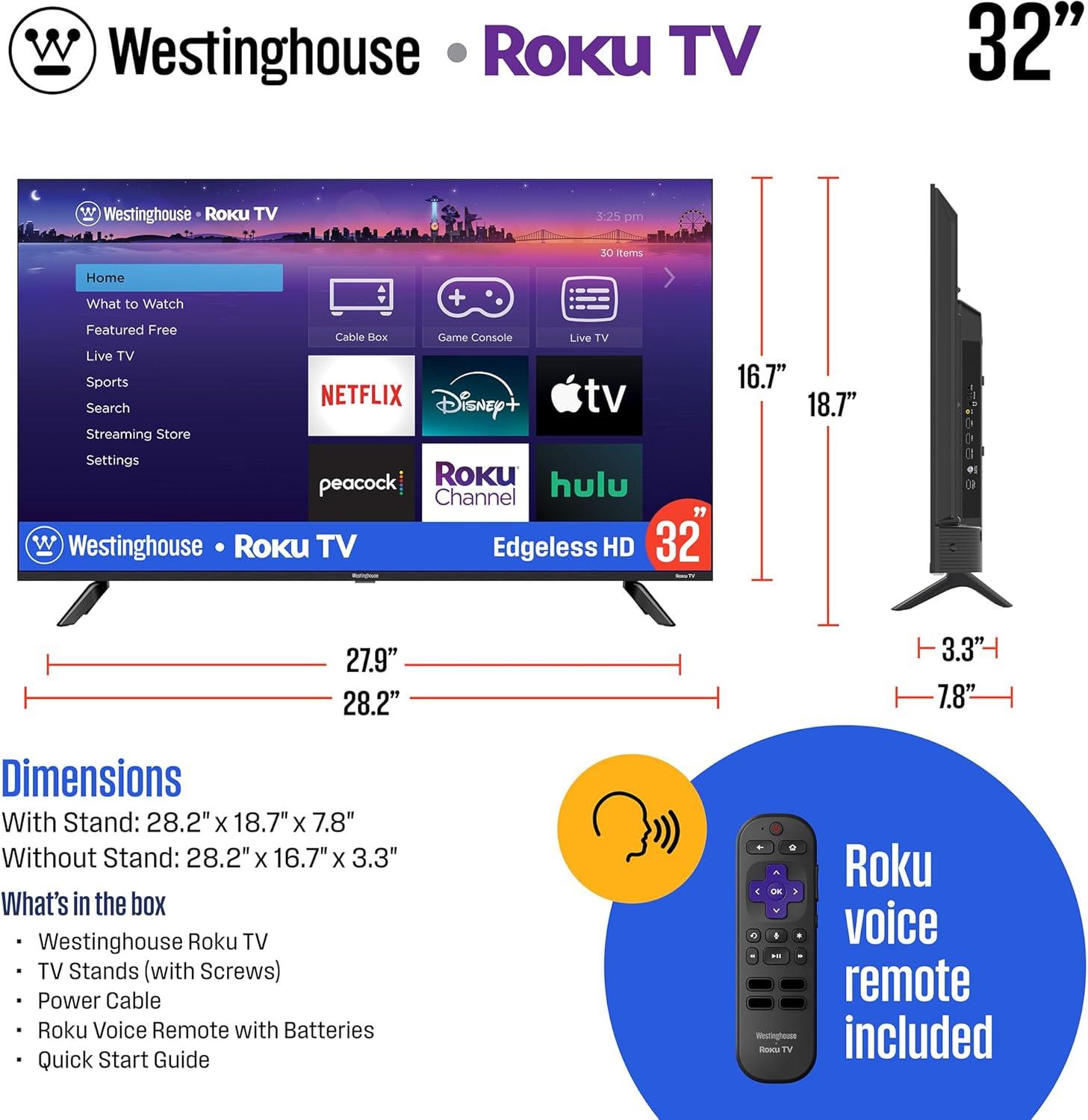 Westinghouse Edgeless Roku TV – 43 Inch Smart Television, 1080P LED FHD w/Wi-Fi & Mobile App Connectivity, Flat Screen Compatible w/Apple AirPlay, Alexa, & Google Assistant(32 Inch)